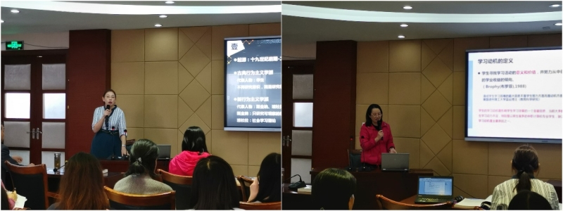 孙文莉老师分享的主题是“行为主义学习理论”,为大家介绍了行为主义的起源、学派,行为主义学习观,鼓励行为的方法和处理问题行为的方法。孙老师依据衰退理论,分享了自己对学校奖券激励机制改进的想法。她结合强化理论,强调了“将学习与快乐的事情联系起来”“力争使课堂教学不可预测”等教学方法。此外,她认为行为主义强调环境,对于学生而言,要重视家庭环境这个因素,家校合作,家长以身作则,创造良好的环境,将更好地促进学生学习。