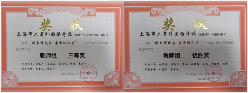 “腹有诗书气自华,读书万卷始通神”。我校“知道”读书社在“好书伴成长 书香润人生——2021徐汇区师生阅读分享活动”中获奖,参赛作品《皇帝内经素问》和《朝花夕拾》分别荣获三等奖、优胜奖。