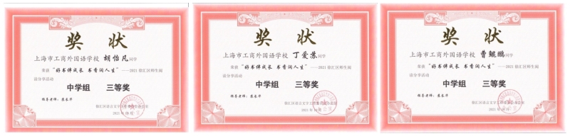 本学期徐汇区语委主办了“好书伴成长 书香润人生”师生阅读分享活动,我校图书馆积极组织并指导学生参加市中职学生组活动。2023班胡怡凡同学的《红楼梦》阅读分享以及2110班丁爱苏和曹鲲鹏同学合作的《观山海》阅读分享皆获学生组三等奖。