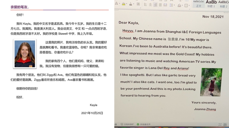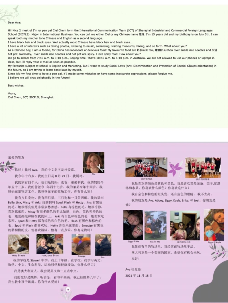 为加深姐妹校之间的联系,提高学生的跨文化交流能力,感受多元文化,开拓国际视野,我校国际教育部打造在线跨文化交流平台,推动ICT成员与澳大利亚姐妹校斯塔维尔中学的同学们长期开展线上笔友交流活动。