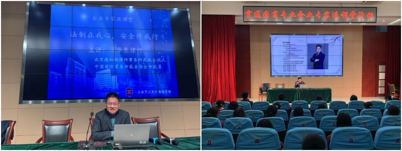 为熏陶学生的法制意识,让学生知法、守法并学会利用法律武器保护自己,2021年12月14日下午,商外一部特别邀请北京德和衡律师事务所上海所高级合伙人、中国国际贸易仲裁委员会仲裁员、华东政法大学法律学院特聘兼职教授汤华东律师前来我校,为商外一部21级中本贯通国际经济与贸易专业、21级中高职贯通国际商务专业的学生做一场专题讲座,主题为“法制在我心,安全伴我行”。